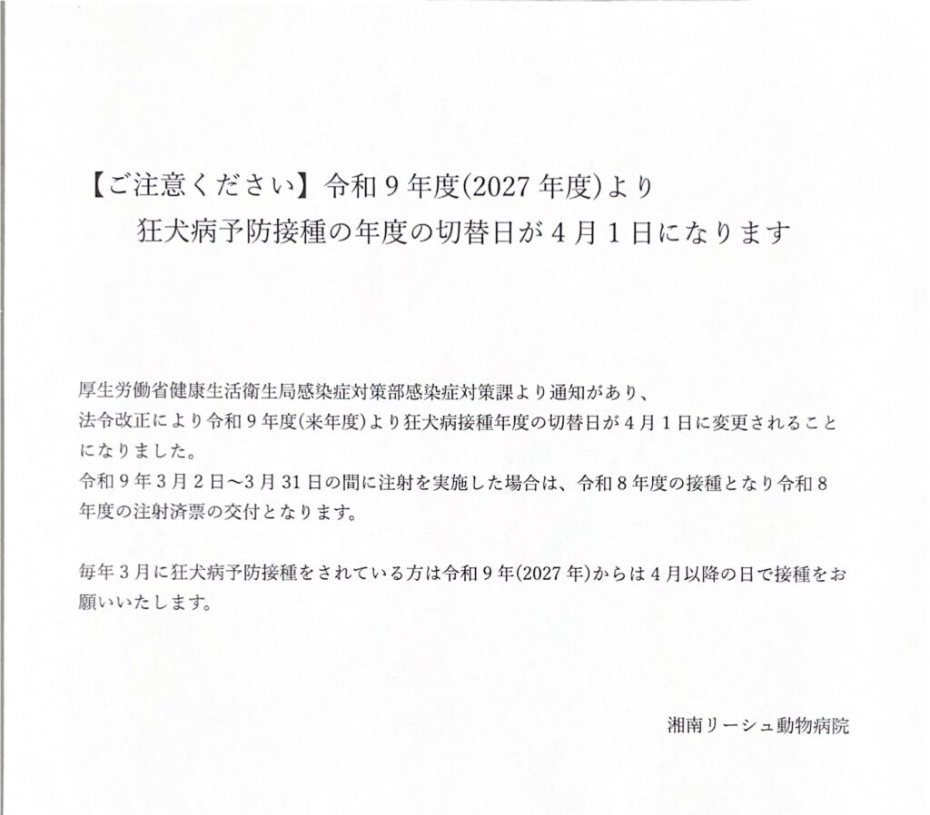 2026.03.01お知らせ 令和9年度(来年)から狂犬病予防注射の時期が変わります。 今年度は従来通り3月2日(月)より令和8年度の狂犬病予防接種が始まりますが、来年令和9年度より狂犬病予防注射の接種時期が変更になります。 ブログ一覧