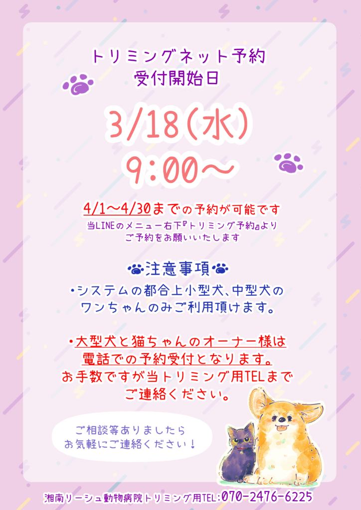 「大型犬、猫ちゃん」のオーナー様は従来通りお電話での受付となりますので、お手数ですがトリミング専用電話までご連絡下さい。